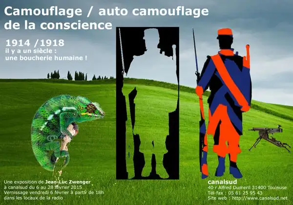 Comme on le voit, si l’invention du camouflage “industriel” date de cette période de la Grande guerre, elle est le reflet d’une époque et de sa culture, comme le cubisme. Ceci dit elle pioche largement dans la conscience prospective animal, où pour éviter les prédateurs, camouflage et enterrement, sont des armes non agressives, mais aussi militaires. Mais sur le fond rien de changé depuis la préhistoire, deux plans, le premier, l’objet ou l’homme immobile, qui se « camoufle » et disparaît devant un second plan (la nature) où il a épousé les formes, les textures, les couleurs. Et pour ce qui est de la guerre, « l’armée » représente toujours « l’école du crime » !