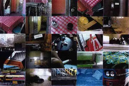 outil de transposition, d’interprétation du réel, au même titre que la langue. Je prends les photos comme je regarde le monde qui m’entoure. Les signes que j’en retiens ,je les formules par indices photographiques. Ils sont juxtaposés et reconstituent une mosaïque. Cette installation a pour effet de détourner l’attention du spectateur d’une seule image sur l’ensemble dont elle fait partie Chaque tesselle est assimilé en écho, et par équivalence est indéxée en mémoire. Il s’agit de chercher le dénominateur commun, le sens de lecture de ces séquences fragmentées.Les possibilités sont multiples ; il est cependant impossible d’attribuer une priorité à certaines images sur d’autres par leur couleur, leur contraste, leur échelle. Le regard chemine au sein de cette balade photographique. Chacun est alors libre de se réapproprier le décor de la pièce et d’en imaginer le scénario. Par métissage de différents points de vue, je me suis en effet intéressée à la constitution de réseaux d’images en quête de correspondance. Par cette manipulation, tel un montage photographique, on assiste à la tentative de reconstruire l’odre de la réalité.