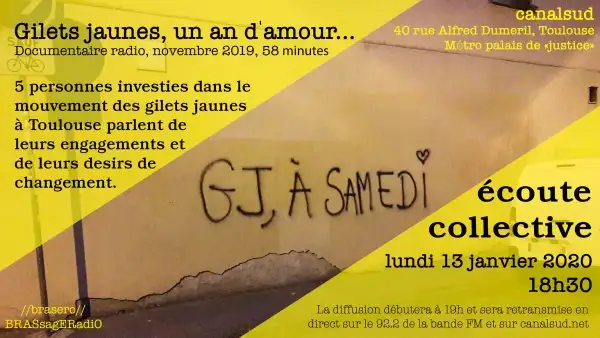 Vous pouvez venir dès 18h30 on y sera, y’aura deux trois bricoles à partager et surtout ensuite on pourra causer. La diffusion dure un peu moins d’une heure ensuite on aura le temps de causer. C’est au 40 rue alfred Duméril, métro palais de "justice". Ça s’écoute sur Toulouse et ses alentours sur les 92.2 de la bande fm et partout dans le monde sur canalsud.net