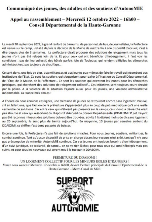 COMMUNIQUÉ D’AUTONOMIE 10 octobre 2022 Aujourd’hui, nous sommes à trente nouveaux jeunes Mineur.es Isolé.es Etranger.es mis à la rue depuis l’évacuation du 20 septembre ! Venez nombreux et nombreuses les soutenir Mercredi 12 octobre - 16h00 - Conseil Départemental de la Haute-Garonne. On continue 💪 Plus d’infos sur place. MERCI !