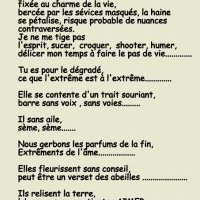 Graine de pollen, oublié pas le temps fixée au charme de la vie bercée par les sévices masqués, la haine se pétalise, risque probable de nuances contraversées. Je ne me tige pas (...)