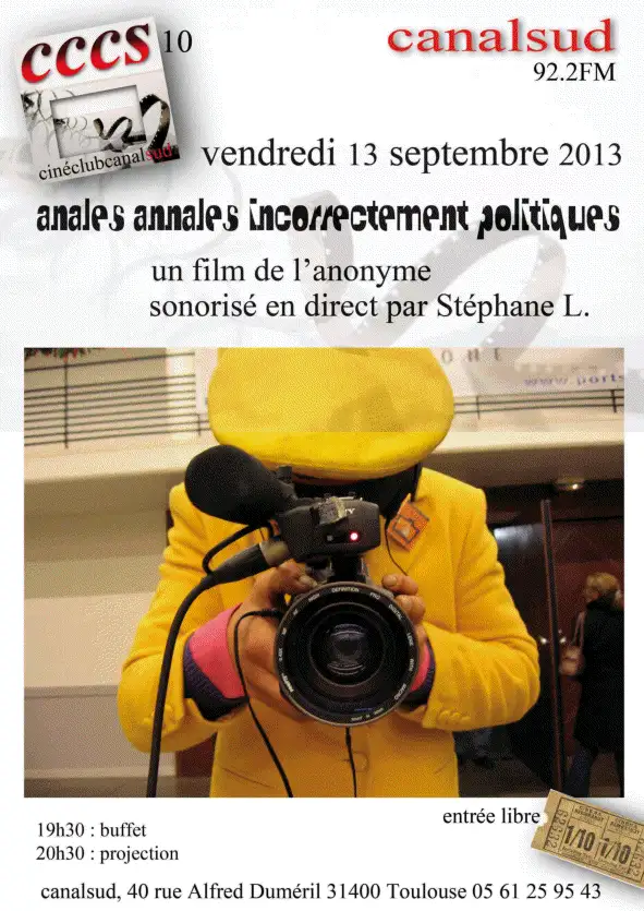 Un vendredi de chaque mois souvent le second ou le troisième, c’est le ciné club de canal sud. Films documentaires fictions, expérimentaux, le plus souvent en présence du réalisateur avec un débat en fin et un buffet au début .