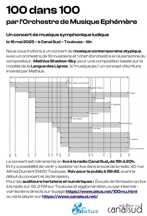 Vendredi 16 mai, dans nos locaux, a eu lieu un concert de musique contemporaine atypique, avec un orchestre de 13 musiciens et 1 chef d’orchestre en la personne du compositeur, Mathius Shadow-Sky, pour une composition basée sur le modèle de la Langue des Lignes, la "musique jeu", un concept d’écriture inventé par Mathius.