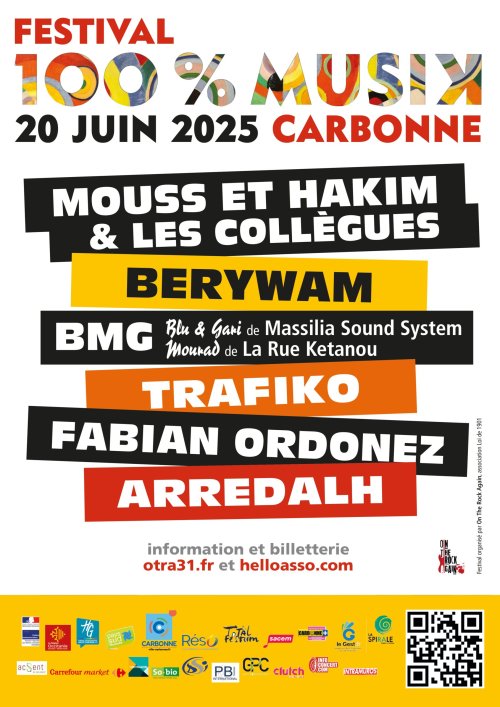 - Festival 100% Musik avec Mouss et Hakim & les Collègues / Berywam / Blu et Gari & Mourad / Trafiko / Fabian Ordonez / Arredalh – Tous publics – Entrée 20€ – Complexe du Bois de Castres .