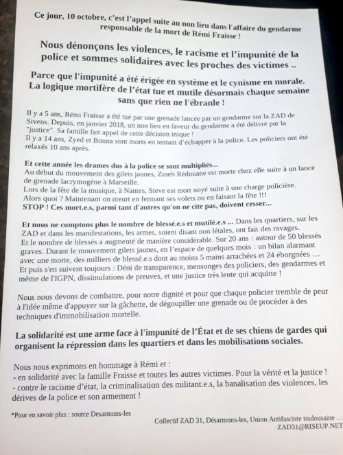 L’APPEL DU NON LIEU pour le gendarme qui a jeté la grenade qui a tué Rémi Fraisse, de 10 octobre, a rassemblé devant le TGI de Toulouse des militants.tes qui dénoncent de nombreuses violences policières et l’inaction de la "justice".