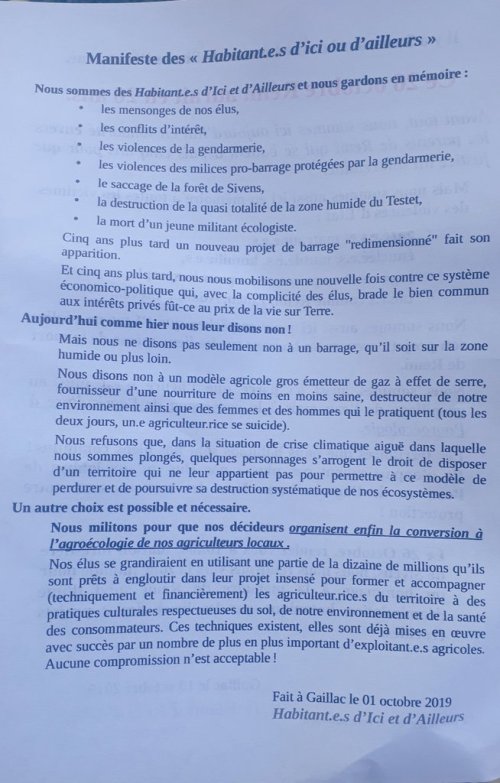 – Barrage de Sivens c’est pas fini, appel à converger le 26 octobre